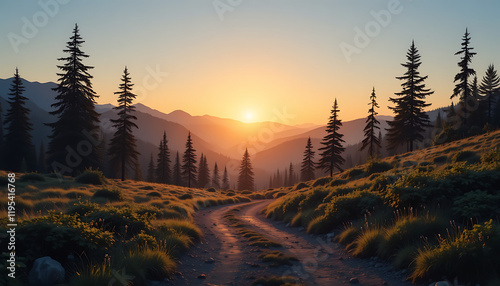 Sunset Mountain Trail, Forest Path and Scenic Landscape