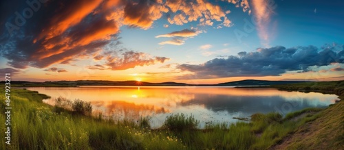 Sunset on a reservoir A sunset on a bolt with a green grass in the spring Beautiful bright clouds on a sunset. Creative banner. Copyspace image