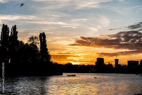 orange, yellow, sunlight, beautiful, sky, bird, twilight, sunset, autumn, summer, attraction, leisure, environment, transportation, facades, exterior, headquarter, corporation, construction, tower, business, landmark, city landscape, people, boat, nature, business building, skyscraper, tree, town, architecture, panorama, urban, travel, building, colourful, lake, landscape, water, bucharest, park, city, romania