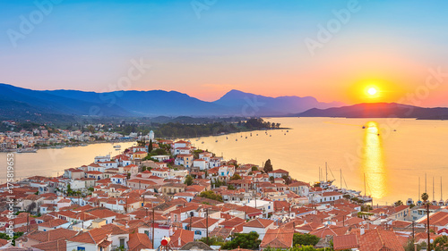 Sunset on Poros island in Aegean sea, Greece