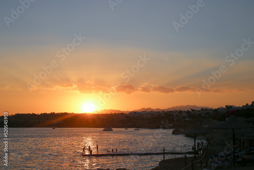 Sunset on the beach in Hurghada. Egyptian dessert in summer evening . African hills and sea horizon.