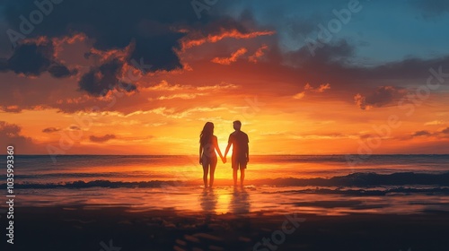 sunset, beach, couple, romantic, holding hands, water, orange, blue, hue, evening, sky, love, romance, sun, shoreline, serene, peaceful, dusk, silhouette, horizon, vacation, happy, joyful, together, connected, calm, relaxation, tranquil, nature, beautiful, idylli, twilight, wave, serenity, human relationships, bonding, lover, affectionate, intimate, walking, seacoast, darling, harmonious, oneness