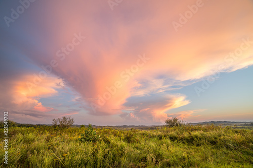 sunset, sky, landscape, sunrise, cloud, sun, nature, orange, evening, cloud, summer, blue, dusk, red, field, sunlight, beautiful, light, dawn, morning, tree, colours, meadow, scene, mountain
