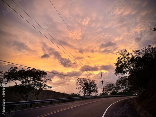 sky, tree, cloud, nature, landscape, sunrise, cloud, evening, light, dark, costa rica, nicaragua, nubes, road, highway, sunset, travel, car, way, driving, street, asphalt, transportation, drive, route, line, rural, transport, country, sun, traffic, fog, countryside