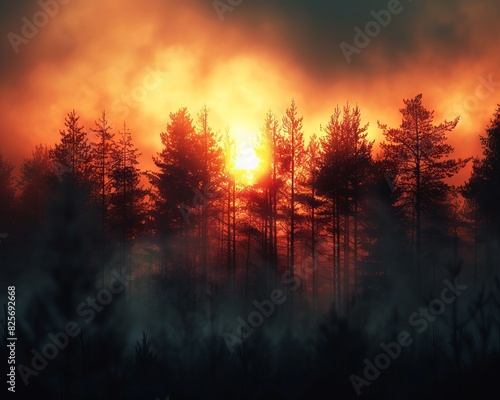Sunset over a forest, with the fiery glow of the setting sun illuminating the silhouettes of tall trees against a smoky sky.