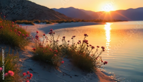 sunset, lake, water, mountain, flower, pink flower, red flower, beach, shore, sand, golden hour, nature, landscape, scenery, beautiful, peaceful, tranquil, serene, calm, romantic, love, hope, beauty, vibrant, colourful, warm, bright, summer, spring, travel, vacation, destination, outdoors, wildflower, wild, fresh, light, glimmering, shining, ray, heaven, paradise, sky