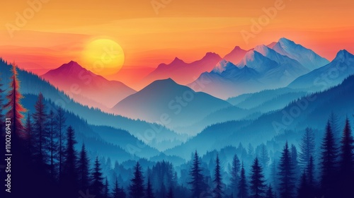 mountain, sunset, landscape, digital artwork, illustration, nature, scenic, colourful, vibrant, gradient, tree, evergreen, peaceful, serene, mountain chain, blue, orange, pink, purple, silhouette, sky, horizon, art, graphic