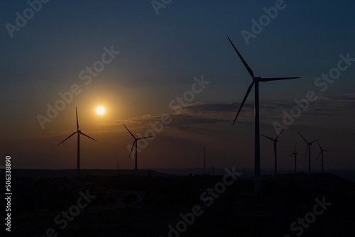 Sunset over a windmill park. An example of renewable energy, clean nature and a sustainable future. Earth Day