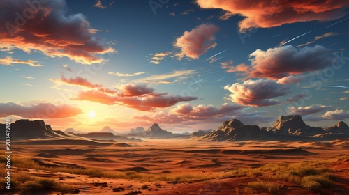 Sunset over alien desert landscape with dramatic sky and moons.