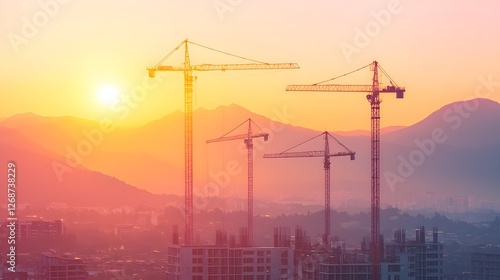 Sunset Over Construction Cranes Silhouetted Against Mountain View