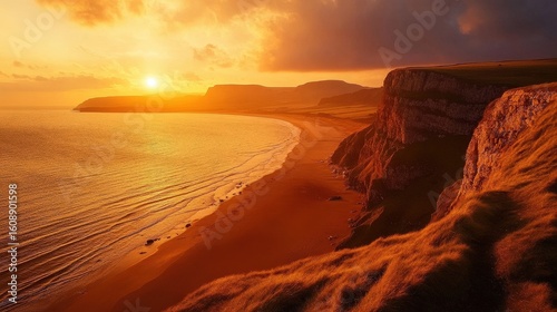 sunset, beach, cliff, coast, ocean, sea, landscape, nature, gold, hours, sky, cloud, wave, sand, rock, dramatic, scenic, view, beautiful, travel, photo, summer, holiday, vacation, calm, peaceful, serene, idylli, seascape, coastline, shore, water, horizon, light, sun, day, bright, amazing, marvellously, stunning