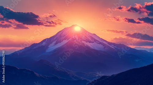 mountain, sunset, sunrise, peak, majestic, landscape, nature, scenery, beautiful, cloud, sky, sun, glow, light, dramatic, horizon, travel, adventure, serene, tranquil, breathtaking, panoramic, view, silhouette, dusk, evening, dawn, twilight, peaceful, natural, highland, elevation, wilderness, scenic, picturesque, environment, geology, formation, snow-capped, colours, gradient, warm, contrast, idylli, beauty, aethereal