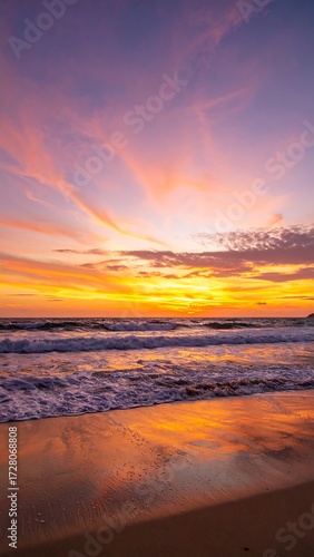 sunset, beach, ocean, wave, sky, gold, cloud, horizon, tranquil, nature, vibrant, colours, dramatic, beautiful, colourful, evening, calm, seascape, golden hour, picturesque, sandy, coast, amazing, landscape