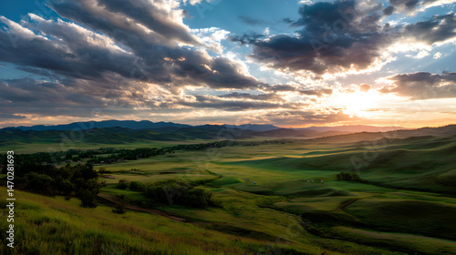 sky, landscape, sunset, nature, cloud, cloud, field, grass, meadow, summer, sun, mountain, blue, green, horizon, sunrise, rural, agriculture, countryside, beautiful, view, weather, storm, country, hill