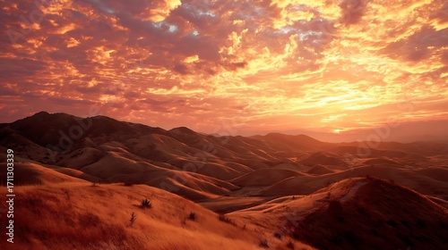 Sunset Over Rolling Hills Vibrant Orange Sky Dramatic Landscape Natural Lighting