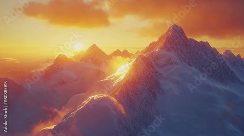 sunset, mountain, snow, peak, winter, landscape, nature, scenic, sky, cloud, sun, orange, yellow, light, ray, cold, majestic, beautiful, vibrant, serene, tranquil, peaceful, awe, inspiring, dramatic, powerful, amazing, wonder, breathtaking, panoramic, vista, view, horizon, altitude, aerial, high, elevation, range, rocky, wilderness, adventure, travel, exploration, freedom