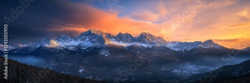 mountain, sunset, snow, range, vale, sky, fiery, winter, landscape, scenic, nature, alps, peak, panorama, cloud, dawn, cold, majestic, serene, view, travel, adventure, beauty, wilderness, background, image, photo, horizon, vista, mountainous, elevated, highland, ridge, summit, rock, frost, ice, hill, wintery