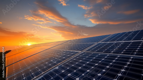 Sunset over solar panels: renewable energy and sustainable technology scenery