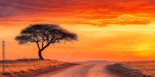 Sunset Over the African Savannah with Acacia Tree and Dramatic Orange Sky