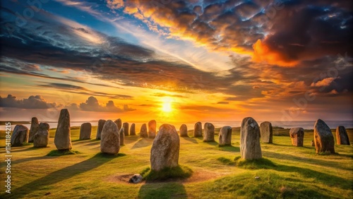 Sunset over the ancient megalithic monument Ale's Stones in Sweden , Sweden, sunset, view, ancient, megalithic