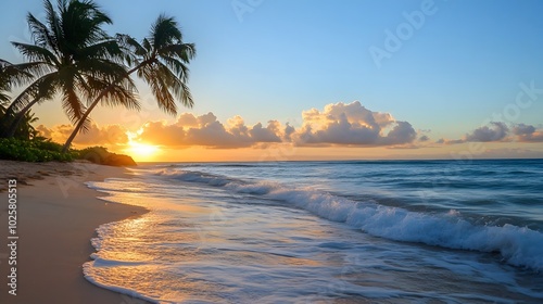 sunset, ocean, beach, palm, tree, wave, sand, sky, cloud, horizon, water, tropical, shore, coastline, blue, yellow, orange, gold, white, foam, calm, tranquil, serene, nature, landscape, seascape, beautiful, scenic, paradise, vacation, travel, relaxation, peace, peaceful, quiet, solitude, escape, get-away