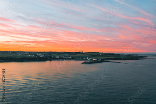 sea, outdoors, aerial, horizon, sunset, landscape, nature, water, coastline, town, bay, sundown, landmark, irish, dublin, ireland, shore, aerial photography, view, coast, travel, up high, panorama, beach, tropical, ocean, colourful, cloud, sunrise, beautiful, background, sky
