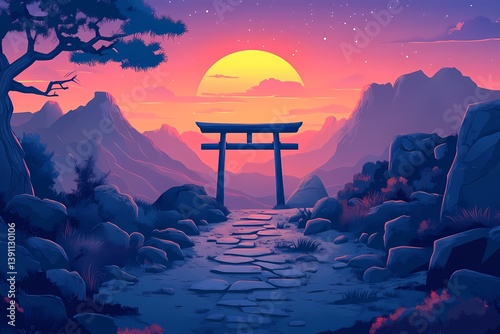 sunset, landscape, scenic view, mountain, japanese culture, artwork, digital illustration, pathway, tranquil, peaceful, sky, cloud, nature, tree, silhouette, abstract, serene, outdoors, colourful, evening, digital artwork, moody, exploration, dreamy, journey, inspiration, travel, asia, scenic beauty, natural light, atmospheric, heavenly, serenity, escape, landform