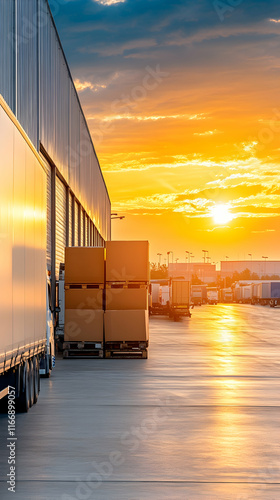 warehouse, sunset, truck, loading, box, logistic, transportation, distribution, industrial, cargo, delivery, shipping, freight, transport, commerce, industry, business, global, export, import, supply, chain, cardboard box, palette, container, good, product, manufacturing, factory, storage, company, teamwork, efficiency, economy, success, growth, market, trade, international, background, image, photo