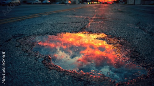 Sunset reflected in a puddle on a city street.
