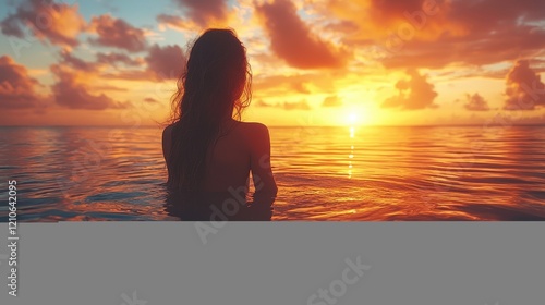 Sunset reflection over calm waters with a woman enjoying nature's beauty