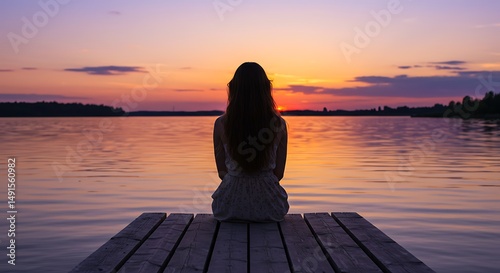 sunset, silhouette, woman, girl, lake, water, dock, pier, peaceful, serene, calm, tranquil, quiet, solitude, contemplation, evening, twilight, sky, nature