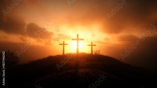 Sunset Silhouette of Three Crucifixion Crosses