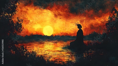 sunset, silhouette, lake, water, sky, fire, orange, red, yellow, cloud, woman, girl, figure, calm, peaceful, tranquil, serene, evening, dusk, nature, landscape, art, painting, digital, artwork, illustration, fantasy, mystical, magical, mysterious, spiritual, meditation, solitude, stillness, quiet, peace, serenity, beauty, picturesque, vibrant, colours, mood, atmosphere, scene, view, image, picture
