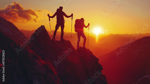 silhouette, male, female, standing, sunset, adventure, hiking, triumph, celebration, nature, outdoors, exploration, journey, accomplishment, scenic, breathtaking