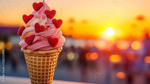 ice cream, ice cream cone, sunset, summer, beach, romantic, love, heart, candy, dessert, sweet, tasty, delicious, food, treat, holiday, vacation, happiness, joy, colourful, vibrant, background, blurred background, bokeh, people, crowd, evening, golden hour, warm, pink, red, whipped cream, february 14, summer, cone, strawberry, beautiful sunset