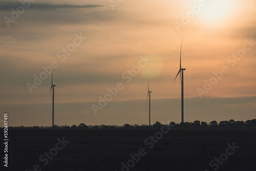 Sunset sun disk lights wind turbines with rotor blades on tops generating green energy as source of electricity. Windfarm at twilight
