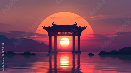 pagoda, silhouette, sunset, gold, hours, sky, water, lake, orange, red, cloud, horizon, mountain, sea, ocean, temple, asia, china, japan, vietnam, travel, landscape, nature, calm, tranquil, serenity, peace, peaceful, beautiful, twilight, evening, sunrise, astronomy, art, photo, digital, illustration, artwork, artistic, graphic, design, background, inspiration, scenery, view