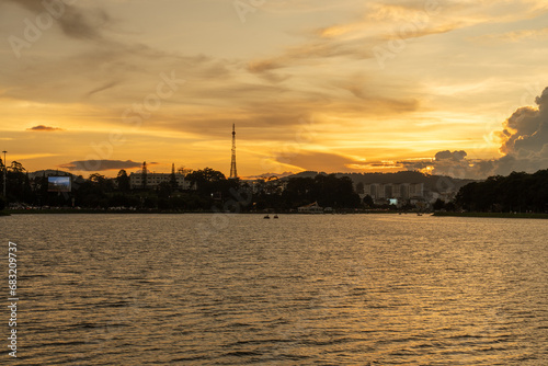 Sunset view of a Da Lat City with development buildings, transportation, market. Tourist city with center square of Da Lat city near Xuan Huong lake