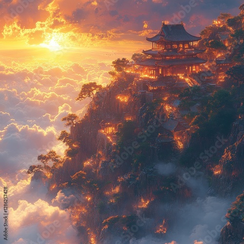 temple, mountain, sunset, cloud, sky, sun, gold, orange, red, scenic, landscape, view, nature, peace, serenity, calm, tranquil, spiritual, mystical, majestic, beautiful, stunning, amazing, breathtaking, picturesque, vibrant, colourful, fantasy, art, digital, illustration, design, travel, asia, china, japan, architecture, building, pagoda, tree, forest, fog, mist, light, shadow, glow, warm, bright, heaven