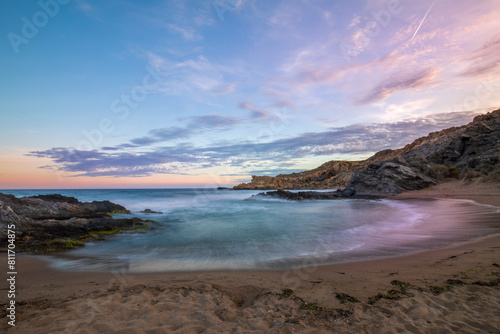 Sunset view of Minas Cove in the Cabo Cope and Puntas de Calnegre Regional Park, with crystal clear waters and colorful sky