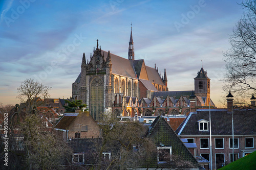 Sunset view of the church in Leiden city.
