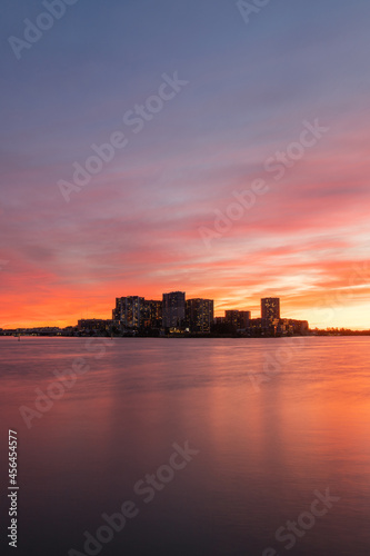 Sunset view over Wentworth Point waterfront skyline, Sydney, Australia.
