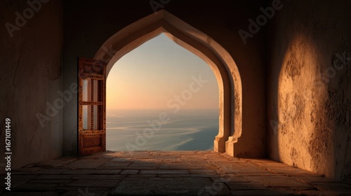Sunset View Through an Arched Window in a Historic Building with Warm Lighting
