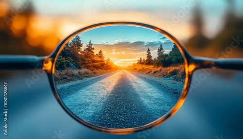 sunset, goggles, road, nature, landscape, horizon, tree, sky, sunlight, travel, perspective, vision, distance, calmness, scenery, warmth, beauty, colours, environment, path, journey, freedom, adventure, calm, solitude, foreground, sharpened, calmness, bright, open space, scenic route, dusk, serene, exploration, daylight, optical, lens, aethereal, peaceful