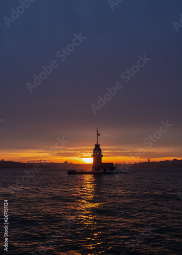 Sunset with Maiden's Tower on Bosphorus and view of historical peninsula. The Maiden's Tower, also known as Leander's Tower (Tower of Leandros) since the medieval Byzantine period.