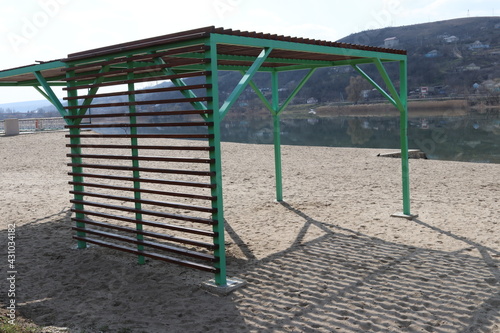 Sunshade on the beach. Park area on the river bank. River beach. A place for people to relax