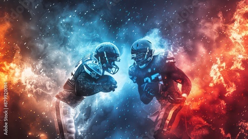 Super bowl players versus. American football player. Sportsman with ball in helmet on stadium in action. Sport and motivation