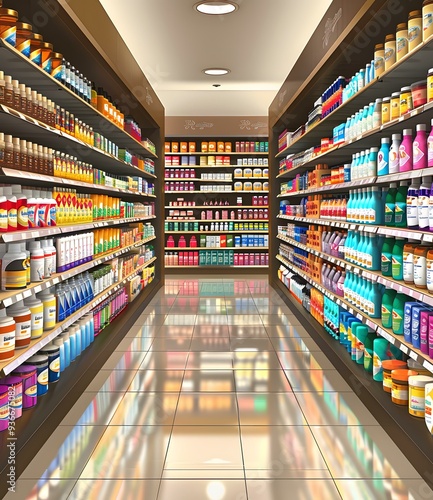 supermarket, aisle, product, grocery, shelf, store, retail, shopping, colourful, interior, design, illustration, graphic, art, digital, background, commercial, food, cleaning, household, hygiene