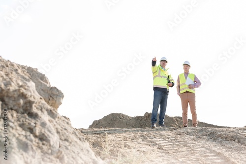 adult, architect, authority, building contractor, business, clear sky, colleague, communication, construction, construction site, construction worker, conversation, copy space, daytime, discussion, engineer, explaining, full-length, gesticulate, holding, industry, looking away, male, man, mid-adult, middle-aged, occupation, outdoors, people, pointing, poland, professional, protection, protective clothing, rock, safety, sand, showing, site manager, standing, supervisor