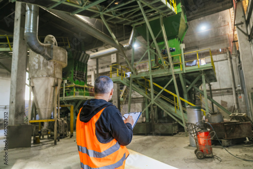 industry, producing, sawdust, woodchips, bark, factory, supervisor, wood, shaving, processing, plant, machinery, inspection, clipboard, note, writing, engineer, technician, quality, control, production, manufacturing, industrial, chips, biomass, energy, renewable, sustainable, resource, waste, recycling, environment, occupational, safety, heavy, pellet, timbering, timber, carpenter's shop, construction, furniture, paper, pulp, bio-fuel, checklist, vest
